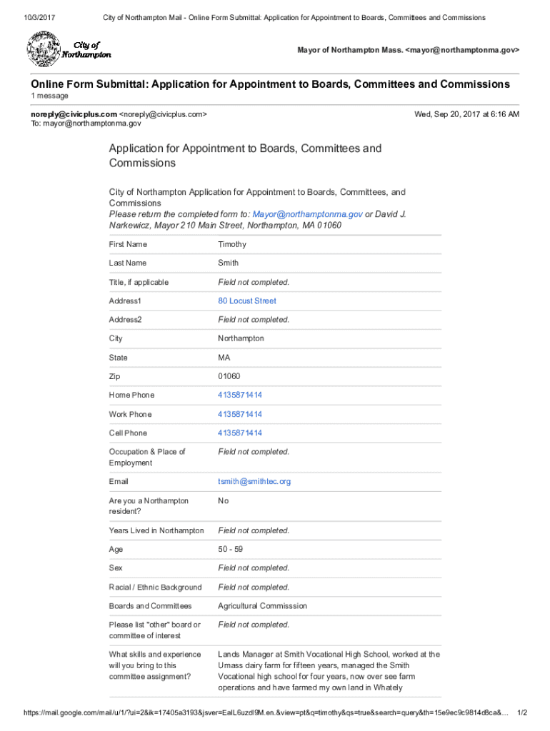 10/3/2017City of Northampton Mail Online Form Submittal: Application for Appointment to Boards, Committees and CommissionsMayor of Northampton Mass. mayor×Northampton.online Form Submittal: Application