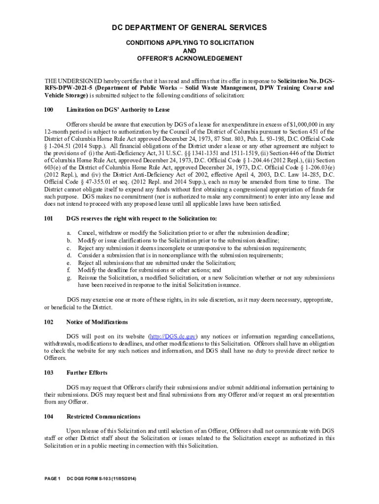 DC DEPARTMENT OF GENERAL SERVICES CONDITIONS APPLYING TO SOLICITATION AND OFFER ORS ACKNOWLEDGEMENT THE UNDERSIGNED hereby certifies that it has read and affirms that its offer in response to Solicitation