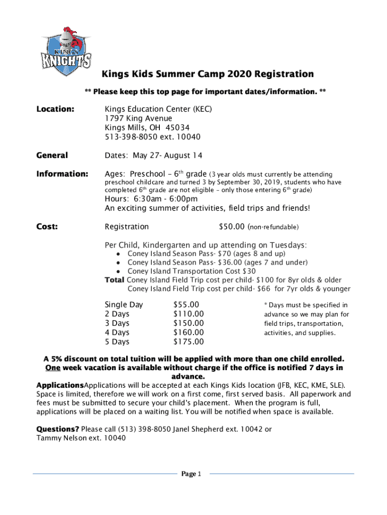 Kings Kids Summer Camp 2020 Registration ** Please keep this top page for important dates/information. **Location: GeneralInformation:Kings Education Center (KEY) 1797 King Avenue Kings Mills, OH
