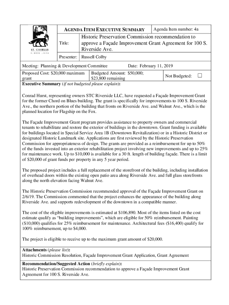Agenda Item number: 4a AGENDA ITEM EXECUTIVE SUMMARY Historic Preservation Commission recommendation to Title: approve a Facade Improvement Grant Agreement for 100 S. Riverside Ave. Presenter: Russell