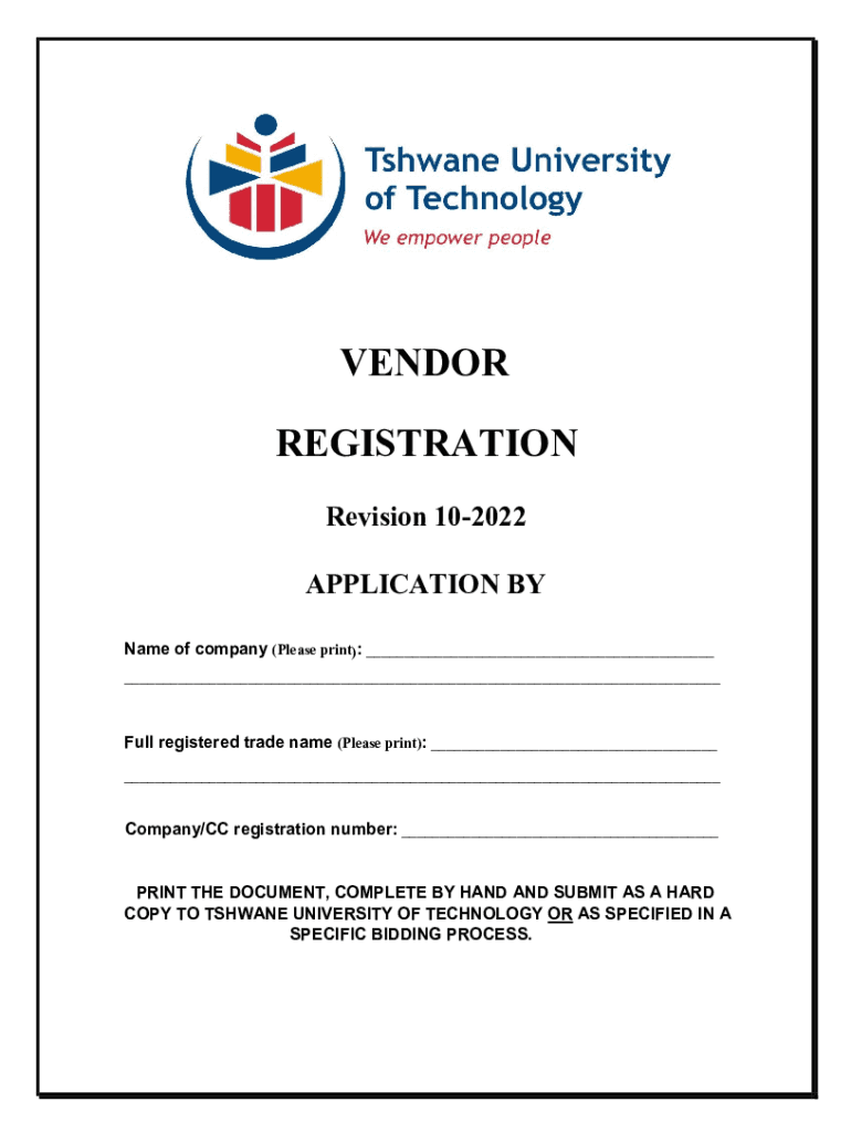 VENDOR REGISTRATION Revision 102022 APPLICATION BY Name of company (Please print): ___ ___Full registered trade name (Please print): ___ ___Company/CC registration number: ___ PRINT THE DOCUMENT,