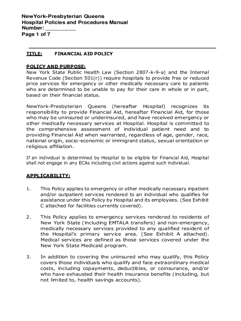 NewYorkPresbyterian Queens Hospital Policies and Procedures Manual Number: ___ Page 1 of 7TITLE:FINANCIAL AID POLICYPOLICY AND PURPOSE: New York State Public Health Law (Section 2807k9a) and the Internal