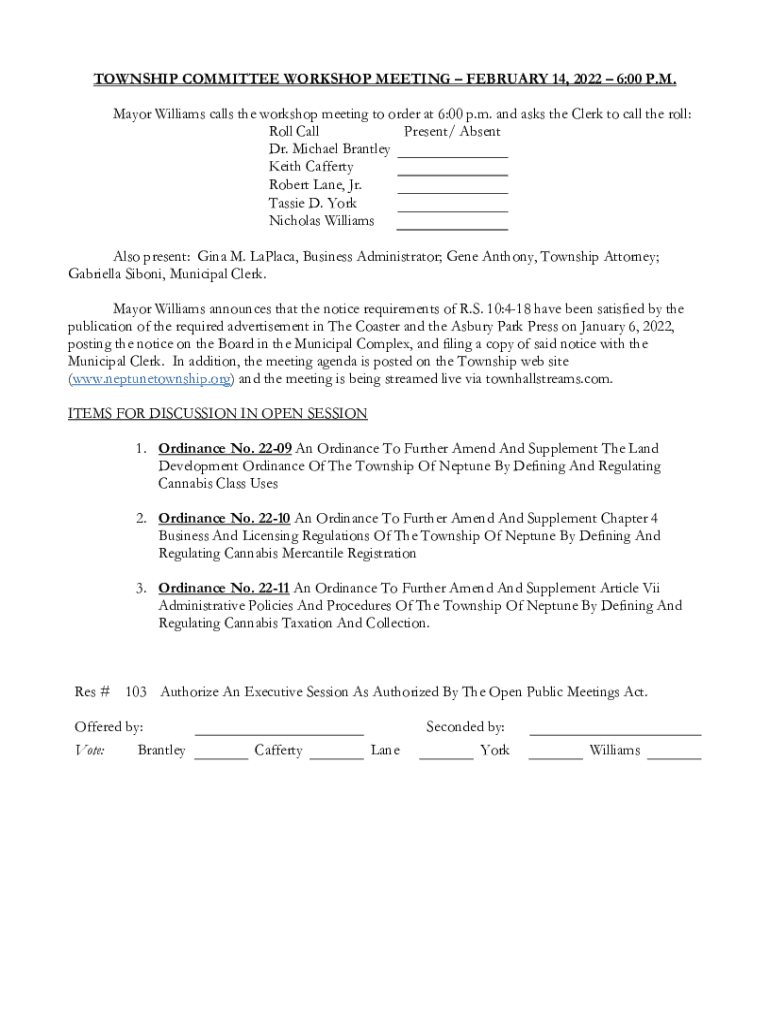 TOWNSHIP COMMITTEE WORKSHOP MEETING FEBRUARY 14, 2022 6:00 P.M. Mayor Williams calls the workshop meeting to order at 6:00 p.m. and asks the Clerk to call the roll: Roll Call Present/ Absent Dr. Michael