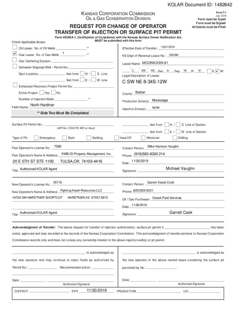 SOLAR Document ID: 1482642KANSAS CORPORATION Commissioner T1 July 2014OIL & GAS CONSERVATION DIVISIONForm must be Typed Form must be Signed All blanks must be FilledREQUEST FOR CHANGE OF OPERATOR