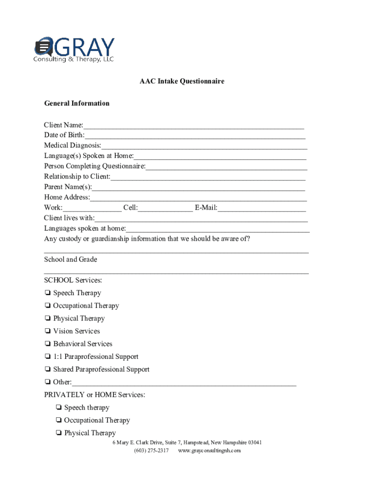 AAC Intake Questionnaire General Information Client Name:___ Date of Birth:___ Medical Diagnosis:___ Language(s) Spoken at Home:___ Person Completing Questionnaire:___ Relationship to Client:___ Parent