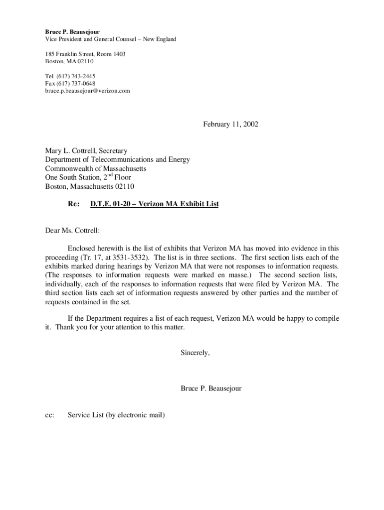 Bruce P. Beauteous Vice President and General Counsel New England 185 Franklin Street, Room 1403 Boston, MA 02110 Tel (617) 7432445 Fax (617) 7370648 Bruce.p.beauteous×verizon.com February 11, 2002Mary