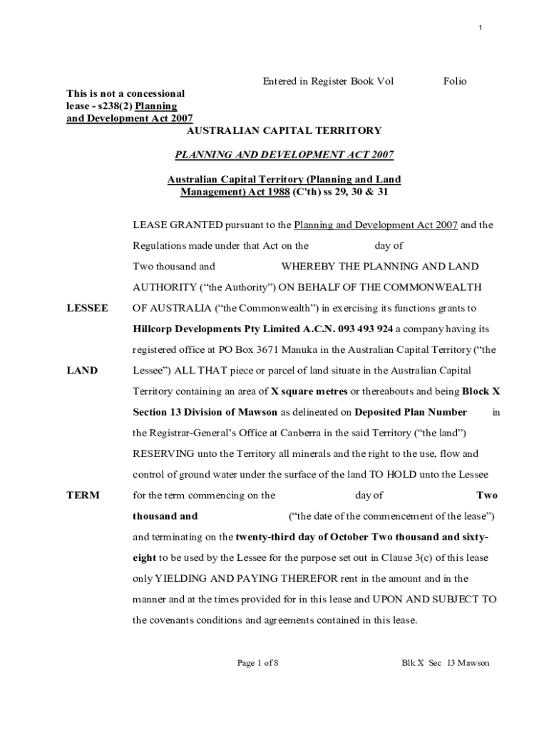 1Entered in Register Book Vol This is not a concessional lease s238(2) Planning and Development Act 2007 AUSTRALIAN CAPITAL TERRITORYFolioPLANNING AND DEVELOPMENT ACT 2007 Australian Capital Territory