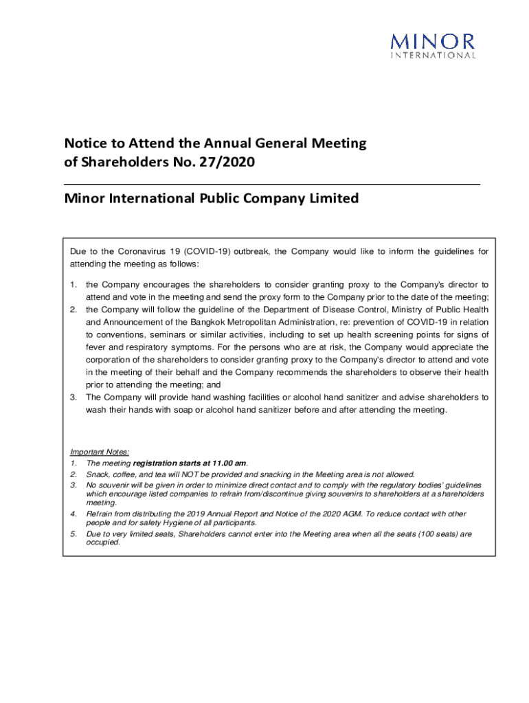 Notice to Attend the Annual General Meeting of Shareholders No. 27/2020 Minor International Public Company Limited to the Coronavirus 19 (COVID-19) outbreak, the Company would like to inform the guidelines