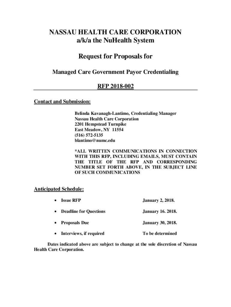 NASSAU HEALTH CARE CORPORATION a/k/a Health System Request for Proposals for Managed Care Government Mayor Credentialing RFP 2018002 Contact and Submission: Belinda KavanaghLantimo, Credentialing
