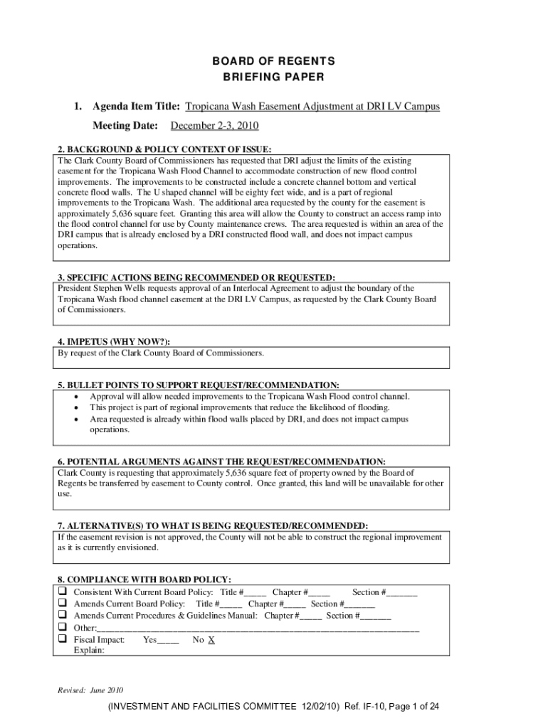 BOARD OF REGENTS BRIEFING PAPER 1. Agenda Item Title: Tropicana Wash Easement Adjustment at DRI LV Campus Meeting Date:December 23, 20102. BACKGROUND & POLICY CONTEXT OF ISSUE: The Clark County Board