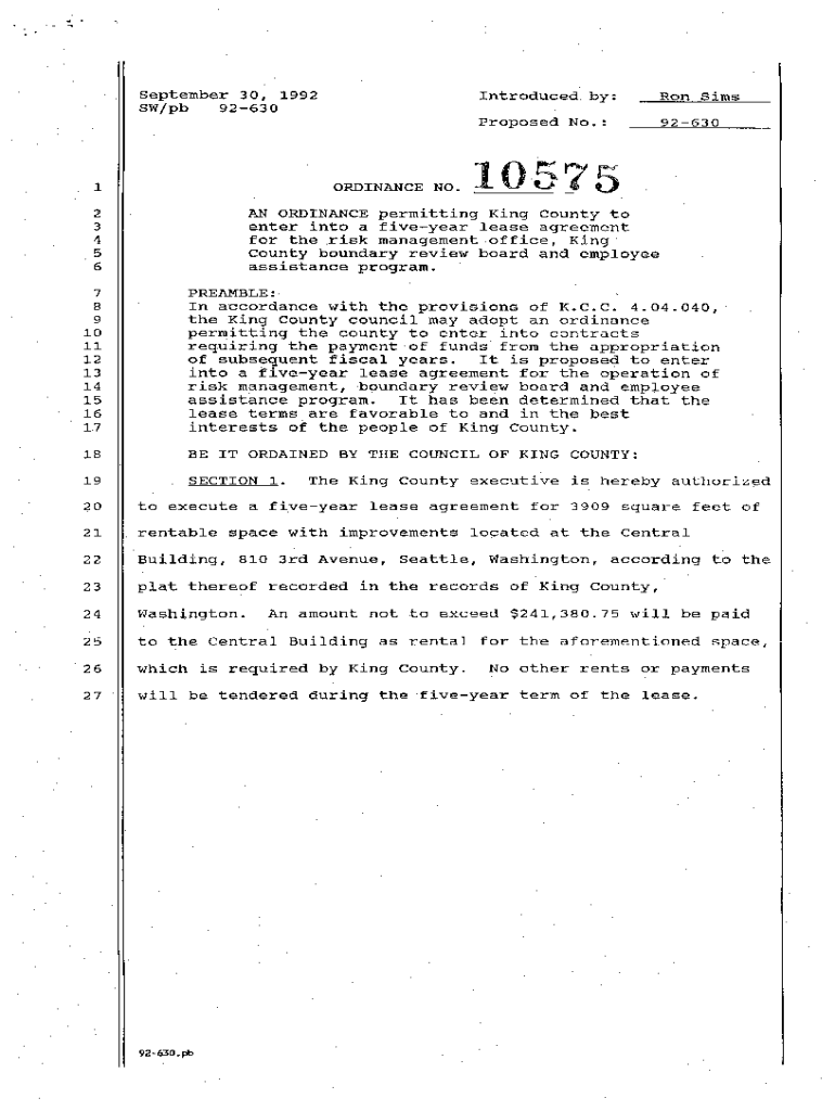 .,.\” September 30, 1992, SW/PB 92630ORDINANCE NO.1Introduced by:Ron SimsProposed No.:9263075\” lo _2 3 4 5 6AN ORDINANCE permitting King County to enter into a five-year lease agreement for the