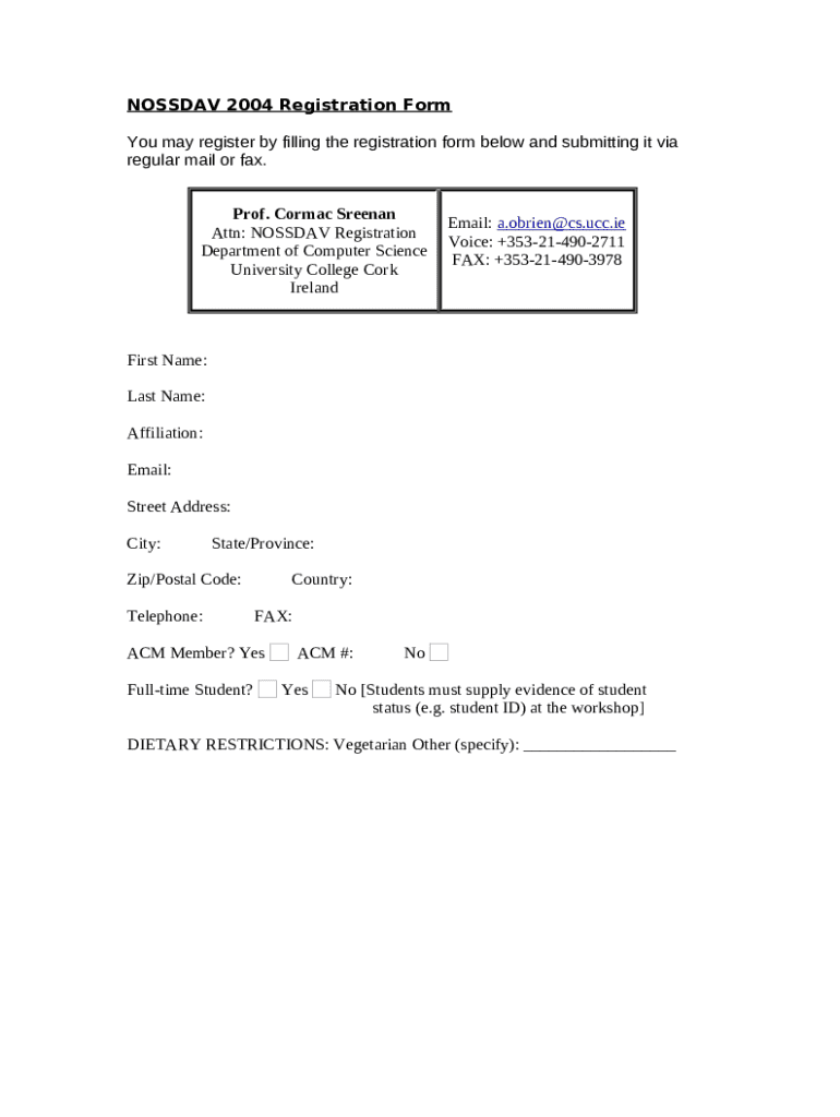 The NOSSDAV 2004 Registration is a fillable form in MS Word extension that has to be completed and signed for specified purposes. In that case, it is provided to the exact addressee to provide some details of any kinds. The completion and signing is able or via a suitable service like PDFfiller. Such applications help to fill out any PDF or Word file without printing out. It also allows you to customize its appearance for your needs and put an official legal electronic signature. Once finished, you send the NOSSDAV 2004 Registration to the recipient or several ones by email or fax. PDFfiller has got a feature and options that make your blank printable. It has a number of settings for printing out. It does no matter how you'll distribute a document - physically or electronically - it will always look neat and firm. To not to create a new writable document from scratch every time, turn the original Word file into a template. Later, you will have an editable sample.