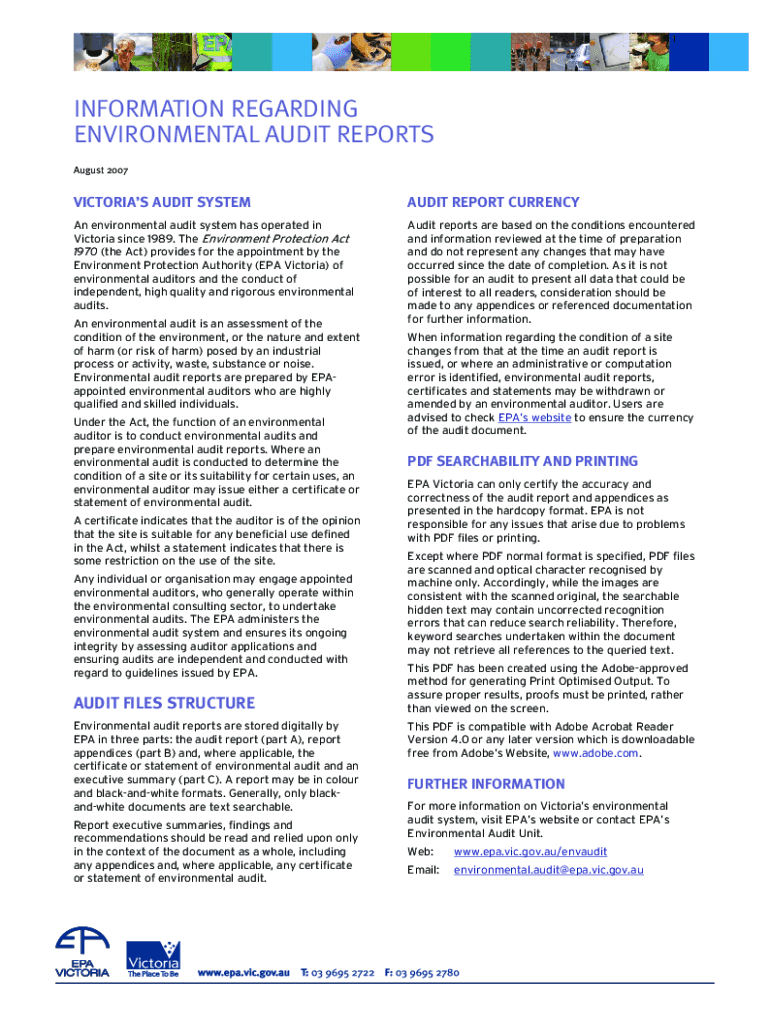 1INFORMATION REGARDING ENVIRONMENTAL AUDIT REPORTS August 2007VICTORIAS AUDIT SYSTEMATIC REPORT Currency environmental audit system has operated in Victoria since 1989. The Environment Protection