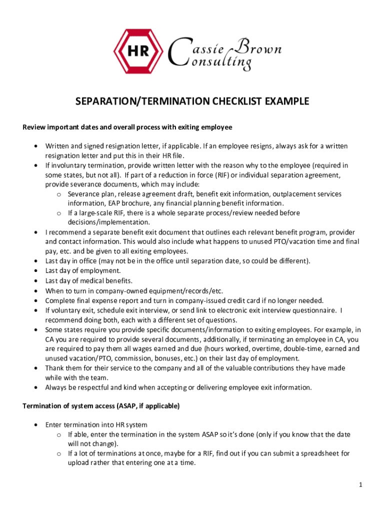 SEPARATION/TERMINATION CHECKLIST EXAMPLE Review important dates and overall process with exiting employee Written and signed resignation letter, if applicable. If an employee resigns, always ask for