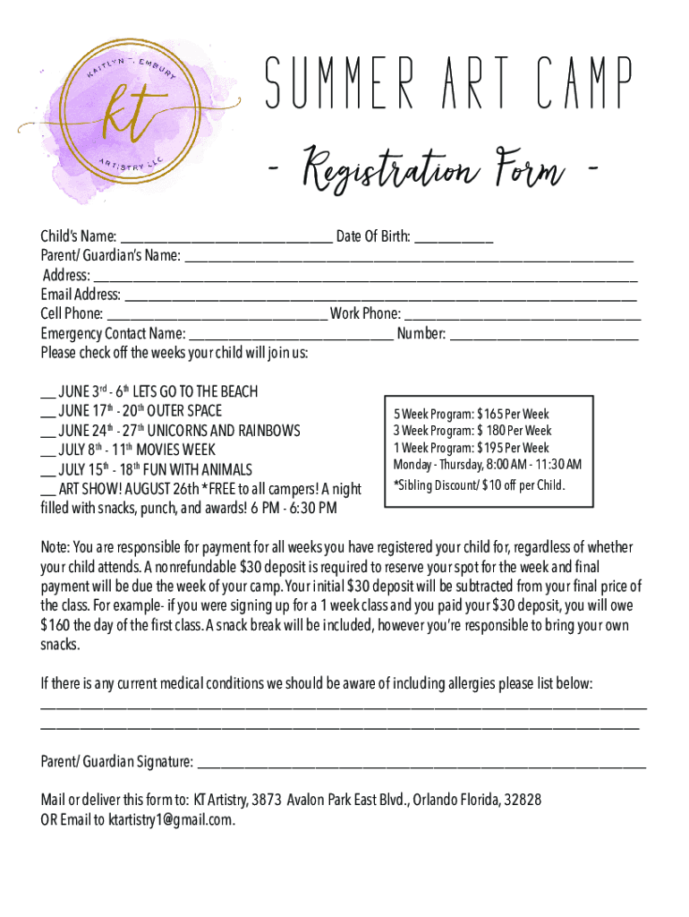SUMMER ART CAMP Registration Form Child's Name: ___ Date Of Birth: ___ Parent/ Guardians Name: ___ Address: ___ Email Address: ___ Cell Phone: ___ Work Phone: ___ Emergency Contact Name: ___ Number: