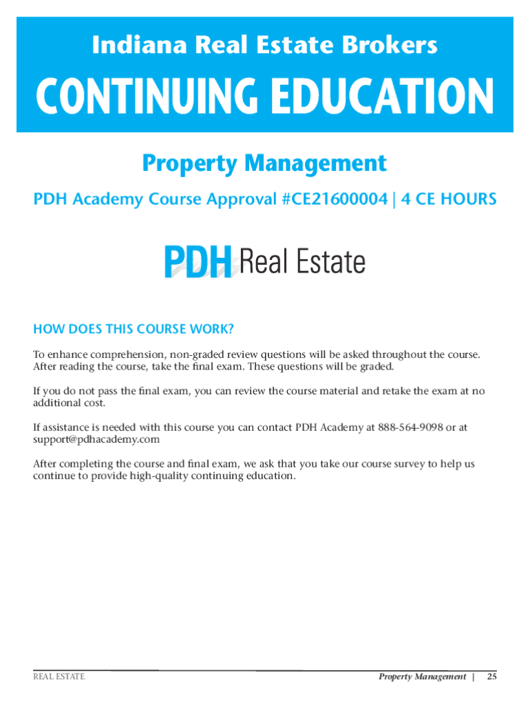Indiana Real Estate BrokersCONTINUING EDUCATION Property Management PDH Academy Course Approval #CE21600004 | 4 CE HOUNSLOW DOES THIS COURSE WORK? To enhance comprehension, nongraded review questions
