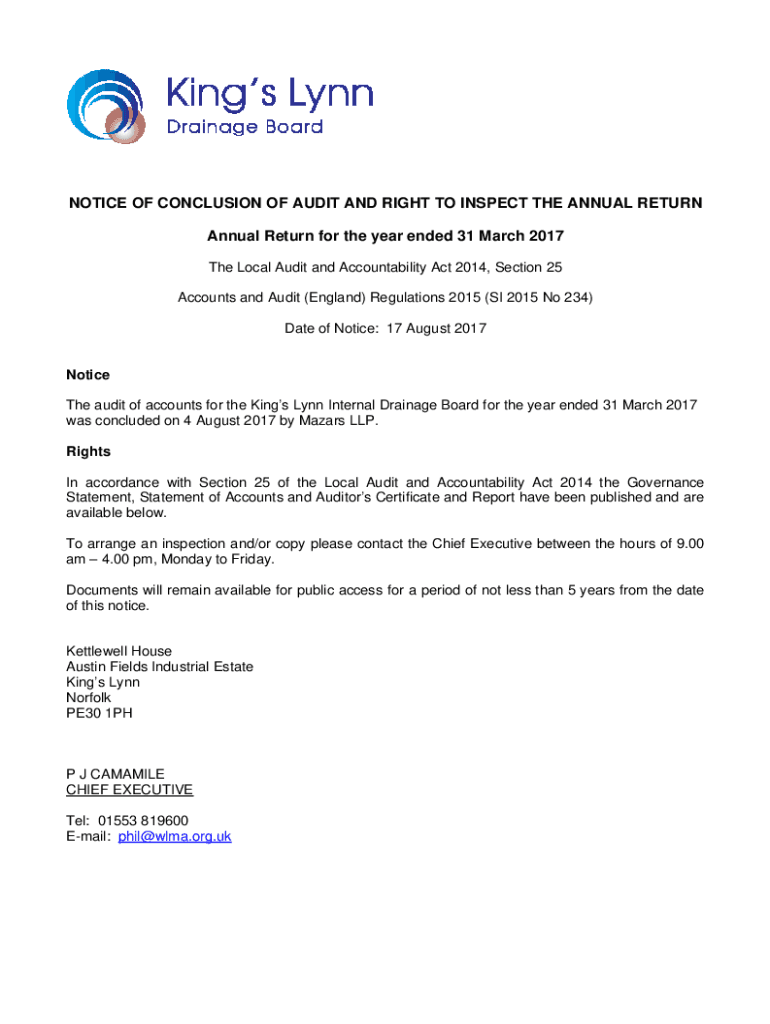 NOTICE OF CONCLUSION OF AUDIT AND RIGHT TO INSPECT THE ANNUAL RETURN for the year ended 31 March 2017 The Local Audit and Accountability Act 2014, Section 25 Accounts and Audit (England) Regulations