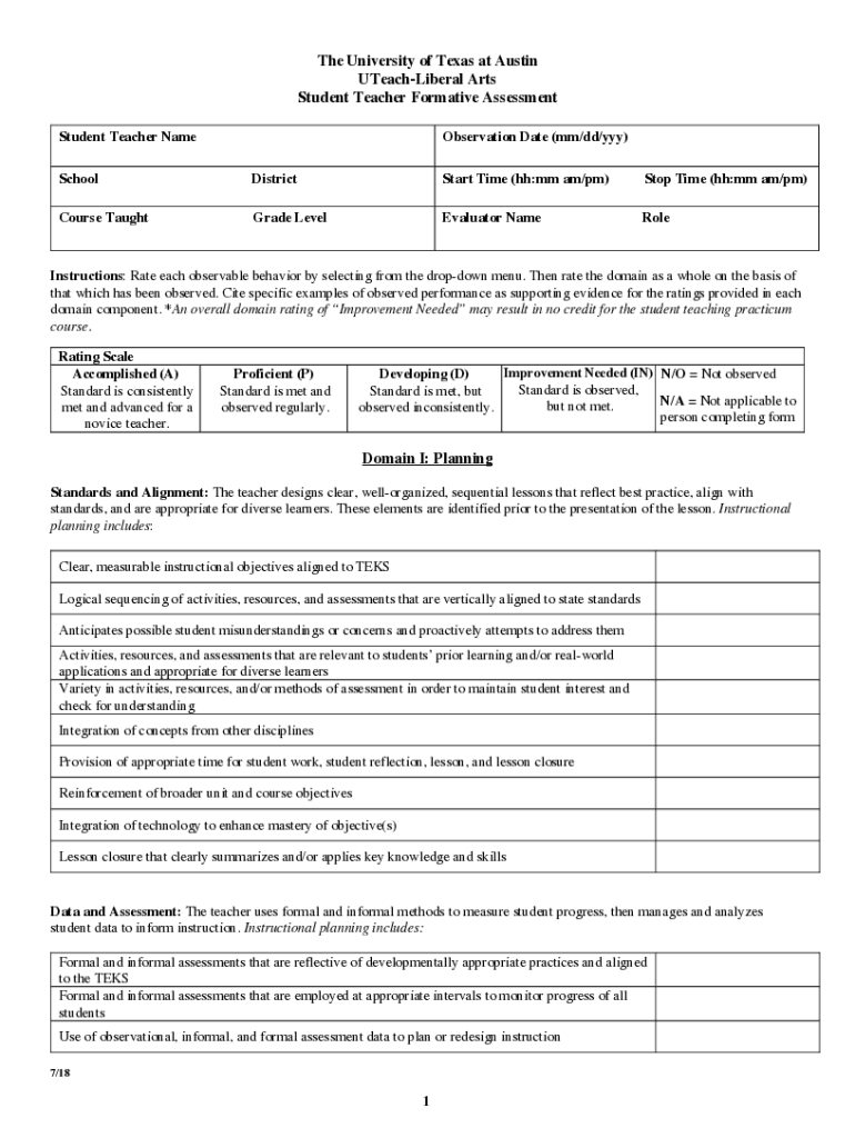 The University of Texas at Austin UTeachLiberal Arts Student Teacher Formative Assessment Student Teacher NameObservation Date (mm/dd/YYY)SchoolDistrictStart Time (HH:mm am/pm)Stop Time (HH:mm am/pm)Course