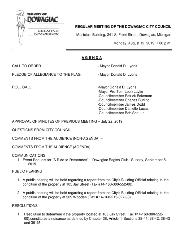 REGULAR MEETING OF THE DOWAGER CITY COUNCIL Municipal Building, 241 S. Front Street, Dowager, Michigan Monday, August 12, 2019, 7:00 p.m.AGENDA CALL TO ORDER Mayor Donald D. LyonsPLEDGE OF ALLEGIANCE