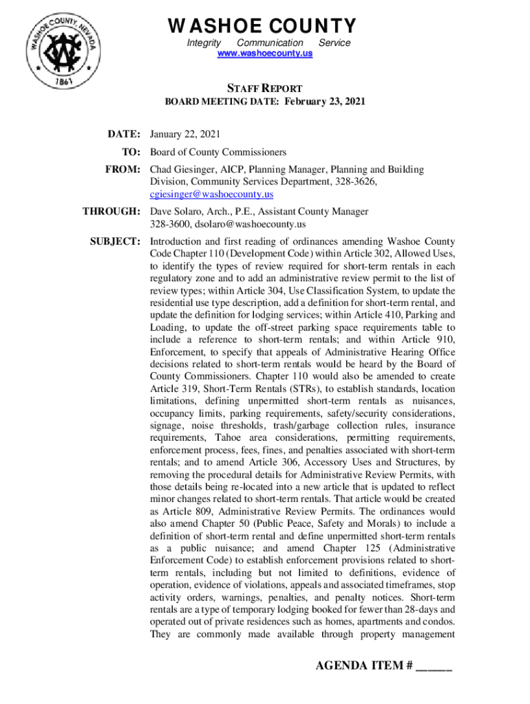 WASHOE COUNTY IntegrityCommunicationServicewww.washoecounty.staff REPORT BOARD MEETING DATE: February 23, 2021DATE: January 22, 2021, TO: Board of County Commissioners FROM: Chad Kissinger, ICP, Planning