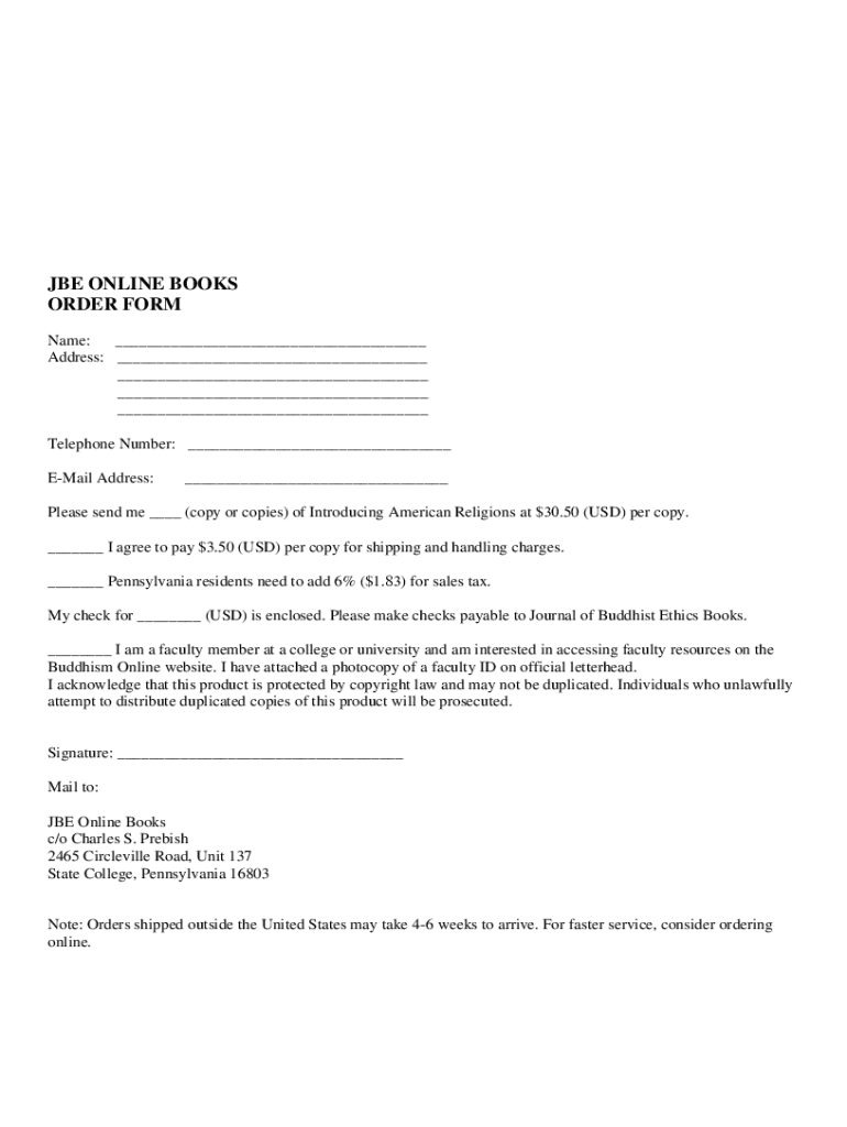 BE ONLINE BOOKS ORDER FORM Name: ___ Address: ___ ___ ___ ___ Telephone Number: ___ Email Address:___Please send me ___ (copy or copies) of Introducing American Religions at $30.50 (USD) per copy.