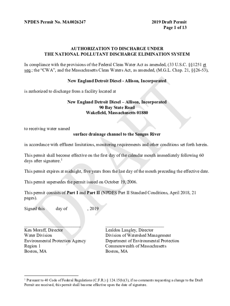 NODES Permit No. MA00262472019 Draft Permit Page 1 of 13AUTHORIZATION TO DISCHARGE UNDER THE NATIONAL POLLUTANT DISCHARGE ELIMINATION SYSTEM In compliance with the provisions of the Federal Clean