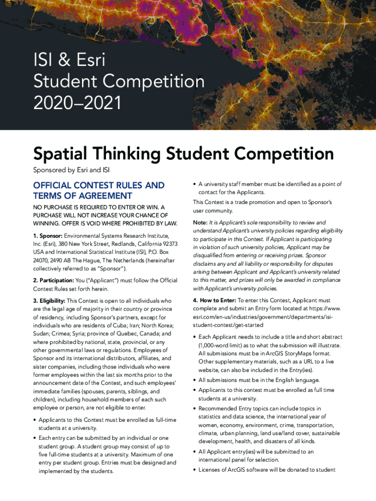 ISI & Esri Student Competition 20202021 Spatial Thinking Student Competition Sponsored by Esri and OFFICIAL CONTEST RULES AND TERMS OF AGREEMENT NO PURCHASE IS REQUIRED TO ENTER OR WIN. A PURCHASE