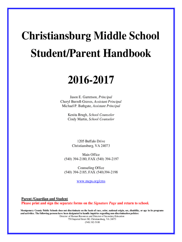 Christiansburg Middle School Student/Parent Handbook 20162017 Jason E. Garret son, Principal Cheryl BurrellGraves, Assistant Principal Michael P. Bath gate, Assistant Principal Benita Brush, School