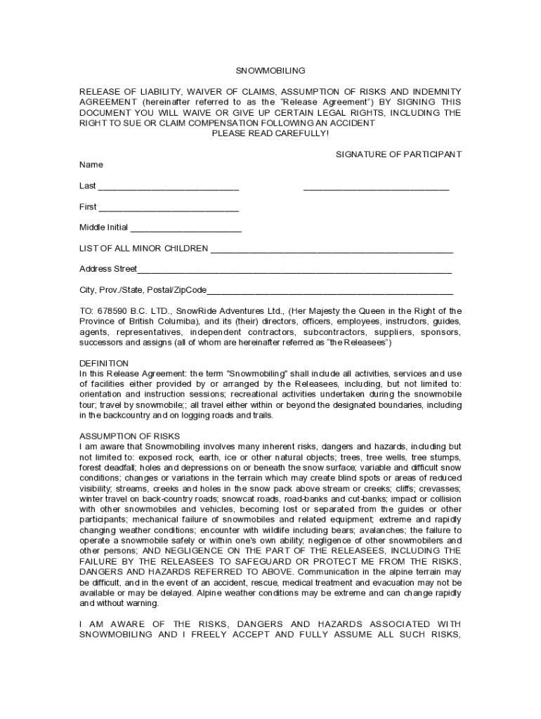 SNOWMOBILING RELEASE OF LIABILITY, WAIVER OF CLAIMS, ASSUMPTION OF RISKS AND INDEMNITY AGREEMENT (hereinafter referred to as the Release Agreement) BY SIGNING THIS DOCUMENT YOU WILL WAIVE OR GIVE