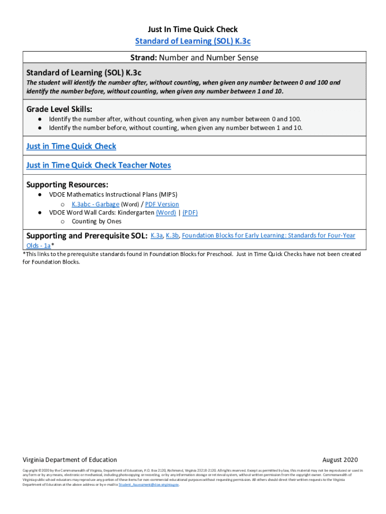 Get the free Just In Time Quick Check Standard of Learning (SOL) K.3c Strand ...