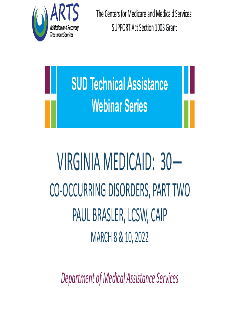 The Centers for Medicare and Medicaid Services: SUPPORT Act Section 1003 Grant SUD Technical Assistance Webinar SeriesVIRGINIA MEDICAID: 30COOCCURRING DISORDERS, PART TWO PAUL Brawlers, LCSW, CAMP