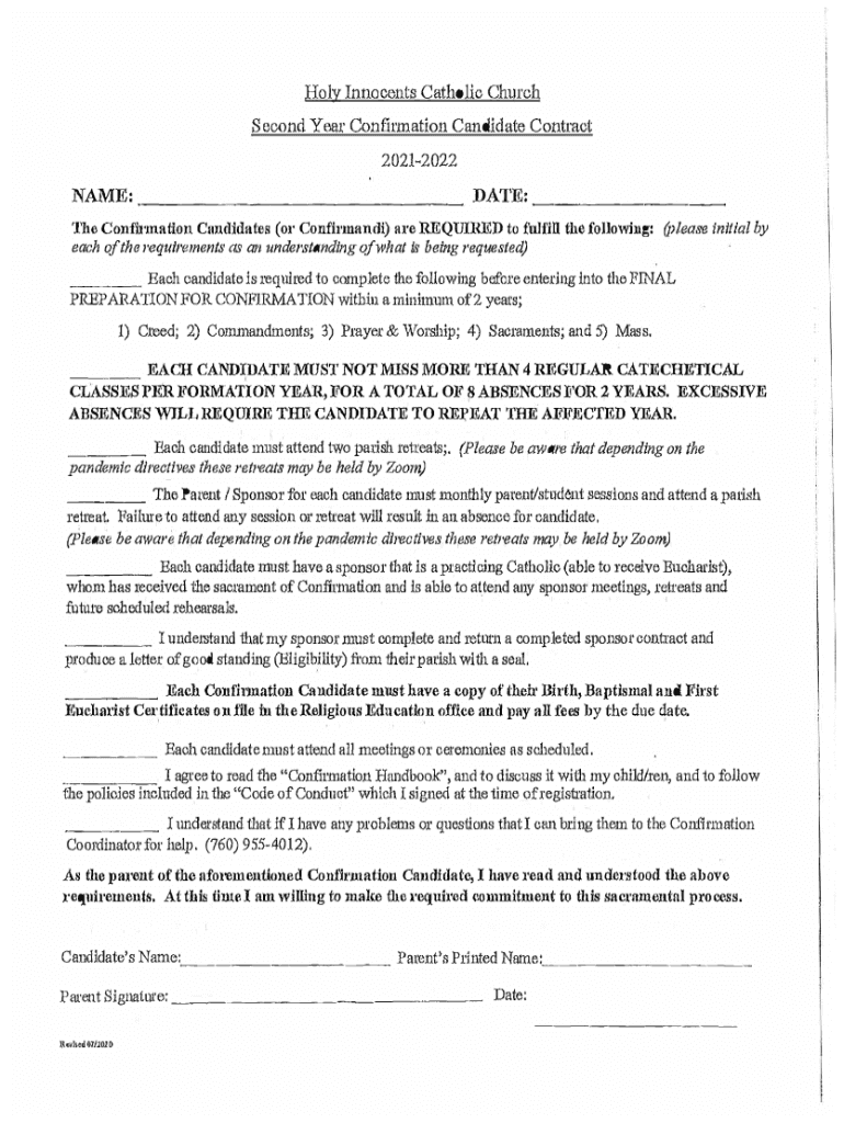 Holy Innocents Catholic Church Second Year Confirmation Candidate Contract 20212022NAME: ___ DATE: ___ Tho Config\'motion Candidates (or Confirmed) are REQUIRED to fulfill the following: (please initial