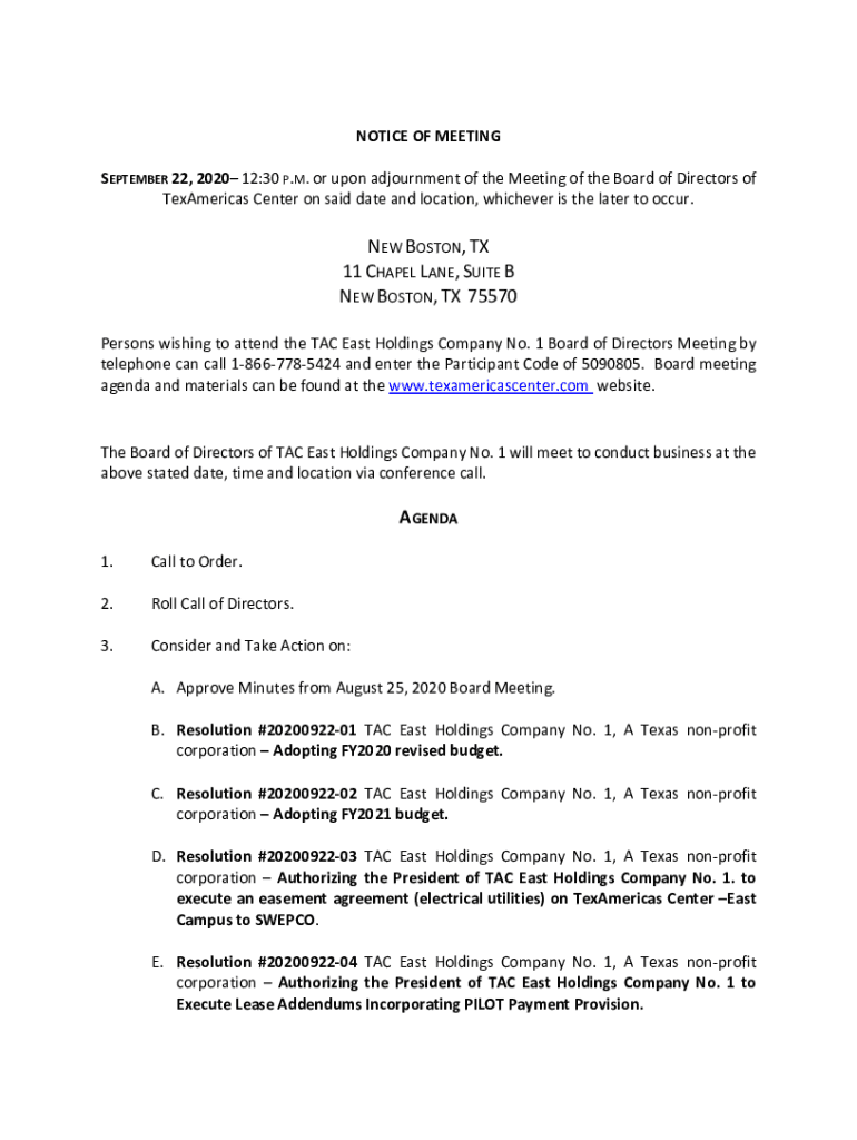 NOTICE OF MEETING SEPTEMBER 22, 2020 12:30 P.M. or upon adjournment of the Meeting of the Board of Directors of Tex Americas Center on said date and location, whichever is the latter to occur. NEW