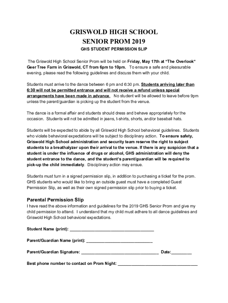 GRISWOLD HIGH SCHOOL SENIOR PROM 2019 GHS STUDENT PERMISSION SLIP The Griswold High School Senior Prom will be held on Friday, May 17th at The Overlook Beer Tree Farm in Griswold, CT from 6pm to 10pm.