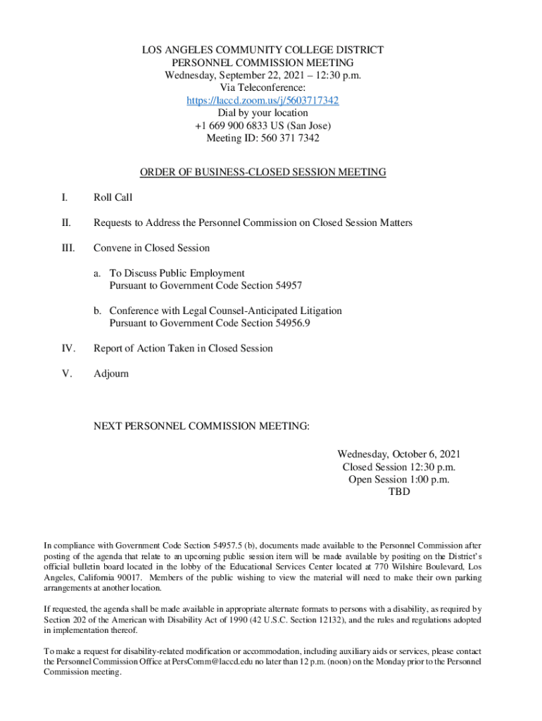 LOS ANGELES COMMUNITY COLLEGE DISTRICT PERSONNEL COMMISSION MEETING Wednesday, September 22, 2021 12:30 p.m. Via Teleconference: https://laccd.zoom.us/j/5603717342 Dial by your location +1 669 900