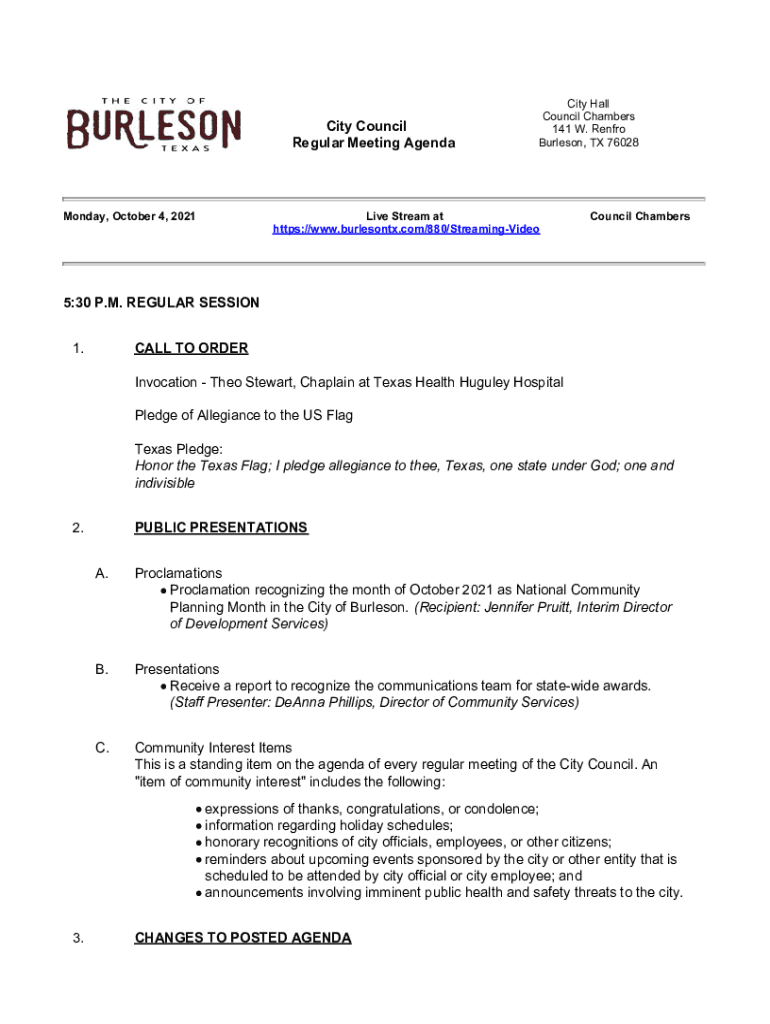 CityCouncil RegularMeetingAgendaCityHall Council Chambers 141W. Reno Burleson,TX76028Monday,October4,2021LiveStreamat https://www.burlesontx.com/880/StreamingVideoCouncilChambers 5:30P. M.REGULARSESSION