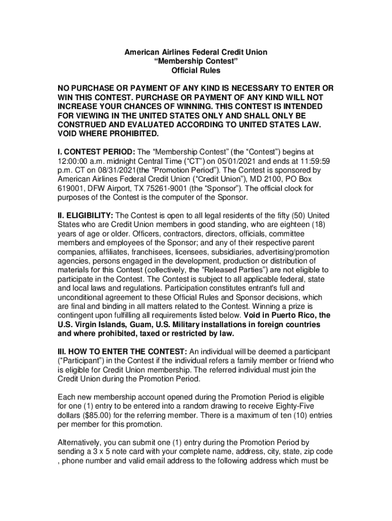 American Airlines Federal Credit Union Membership Contest Official Rules NO PURCHASE OR PAYMENT OF ANY KIND IS NECESSARY TO ENTER OR WIN THIS CONTEST. PURCHASE OR PAYMENT OF ANY KIND WILL NOT INCREASE