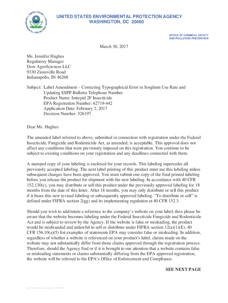 UNITED STATES ENVIRONMENTAL PROTECTION AGENCY WASHINGTON, DC 20460 OFFICE OF CHEMICAL SAFETY AND POLLUTION PREVENTION March 30, 2017, Ms. Jennifer Hughes Regulatory Manager Dow Agriscience LLC 9330