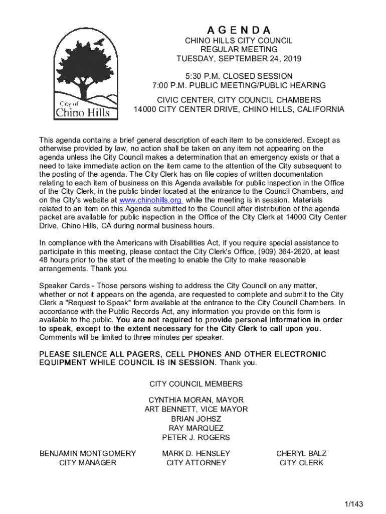AGENDA CHINO HILLS CITY COUNCIL REGULAR MEETING TUESDAY, SEPTEMBER 24, 2019 5:30 P.M. CLOSED SESSION 7:00 P.M. PUBLIC MEETING/PUBLIC HEARING City chino HillsCIVIC CENTER, CITY COUNCIL CHAMBERS 14000