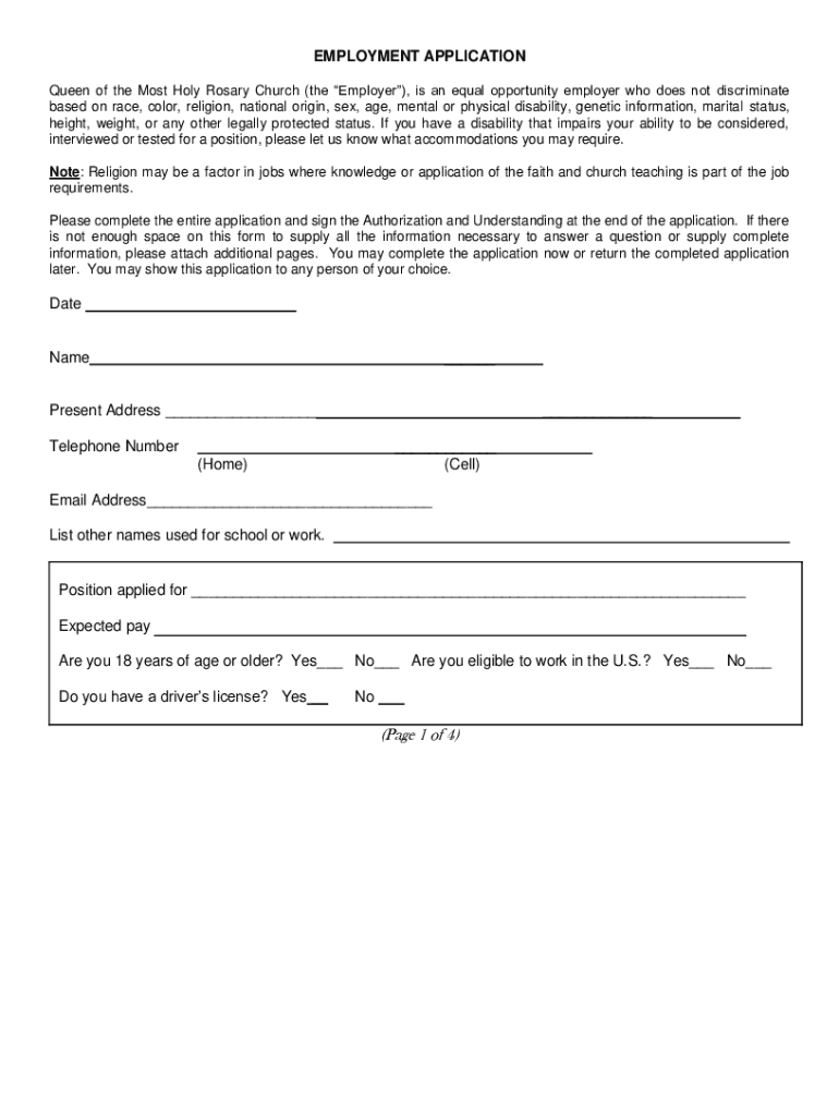 EMPLOYMENT APPLICATION Queen of the Most Holy Rosary Church (the Employer), is an equal opportunity employer who does not discriminate based on race, color, religion, national origin, sex, age, mental