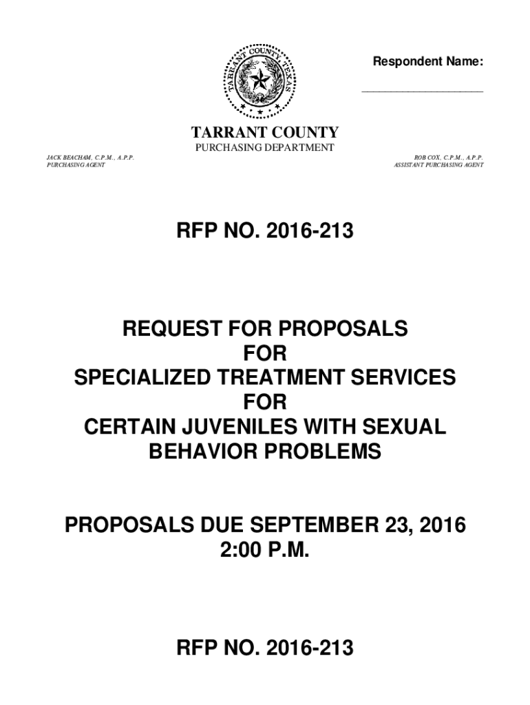 Respondent Name: ___TARRANT COUNTY PURCHASING DEPARTMENT JACK BEA CHAM, C.P.M., A.P.P. PURCHASING AGENT COX, C.P.M., A.P.P. ASSISTANT PURCHASING AGENT RFP NO. 2016213REQUEST FOR PROPOSALS FOR SPECIALIZED