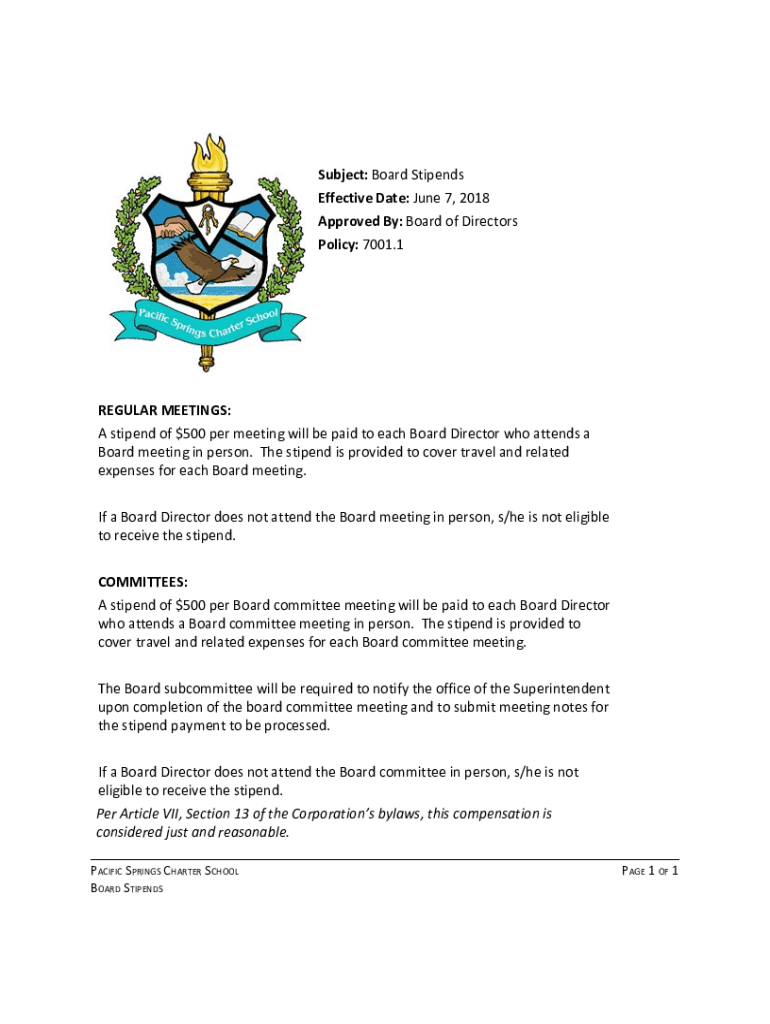 Subject: Board Stipends Effective Date: June 7, 2018, Approved By: Board of Directors Policy: 7001.1REGULAR MEETINGS: A stipend of $500 per meeting will be paid to each Board Director who attends