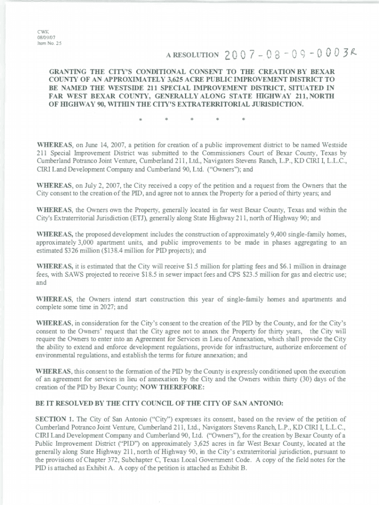CWA 08/09/07 Item No. 25A RESOLUTION2Q Q 7 Q 8 0C) 0Q QC fl...GRANTING THE CITY\'S CONDITIONAL CONSENT TO THE CREATION BY BEXAR COUNTY OF AN APPROXIMATELY 3,625 ACRE PUBLIC IMPROVEMENT DISTRICT TO