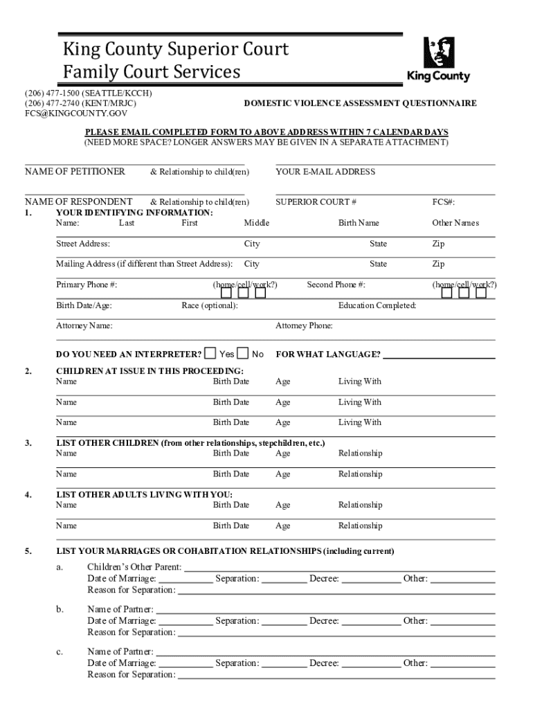 King County Superior Court Family Court Services (206) 4771500 (SEATTLE/CCH) (206) 4772740 (KENT/MJC) FCS×KINGCOUNTY.DOMESTIC VIOLENCE ASSESSMENT QUESTIONNAIREPLEASE EMAIL COMPLETED FORM TO ABOVE
