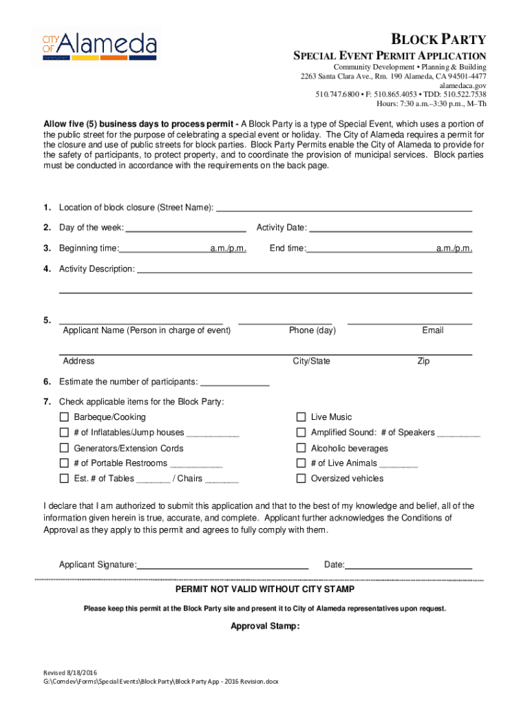 BLOCK PARTY SPECIAL EVENT PERMIT APPLICATION Community Development Planning & Building 2263 Santa Clara Ave., Rm. 190 Alameda, CA 945014477 Alameda.gov 510.747.6800 F: 510.865.4053 TDD: 510.522.7538