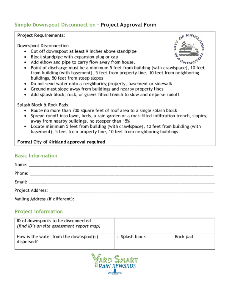 The wwwkirklandwagovfilessharedassetssimple downspout disconnectionproject approval form requires information such as the project location, scope of work, and contact details of parties involved.