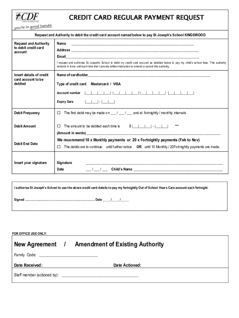 CREDIT CARD REGULAR PAYMENT REQUEST and Authority to debit the credit card account named below to pay St Josephs School KINGHOOD Request and Authority to debit credit card accountable___Address ___