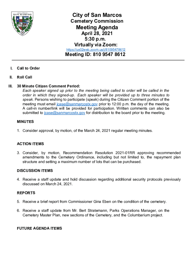 City of San MarcosCemetery CommissionMeeting Agenda April 28, 2021 5:30 p.m. Virtually via Zoom:https://us02web.zoom.us/j/81095478612Meeting ID: 810 9547 8612 I. Call to Order. Roll Calling.30 Minute