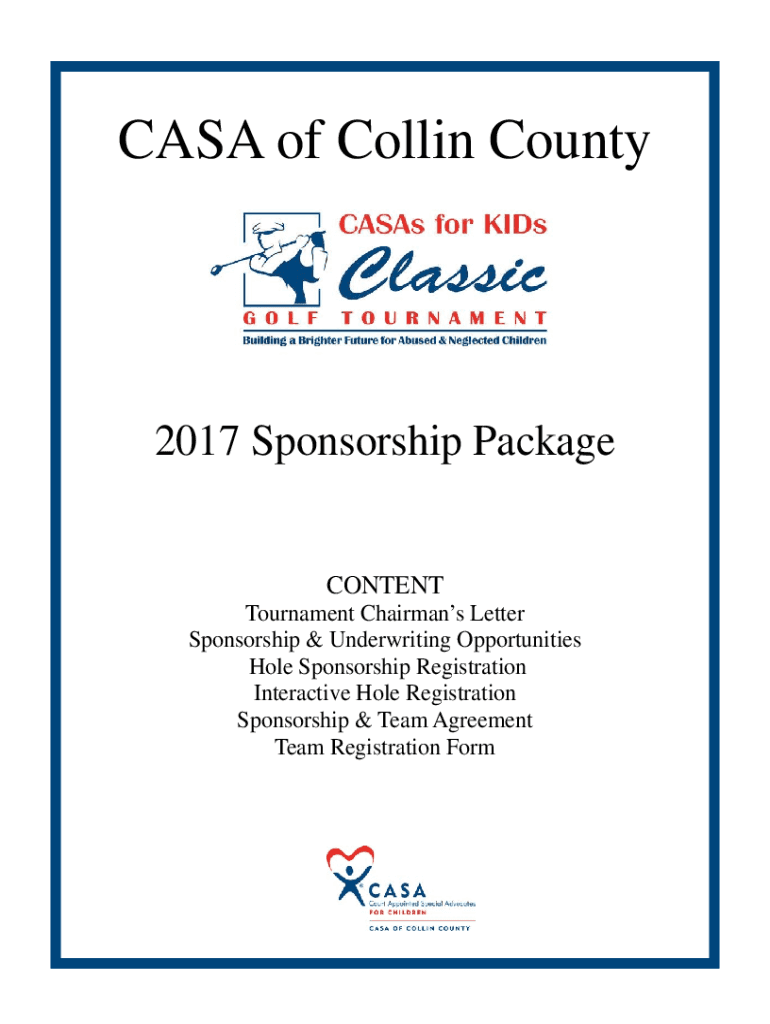 CASA of Collin County2017 Sponsorship PackageCONTENT Tournament Chairman Letter Sponsorship & Underwriting Opportunities Hole Sponsorship Registration Interactive Hole Registration Sponsorship & Team