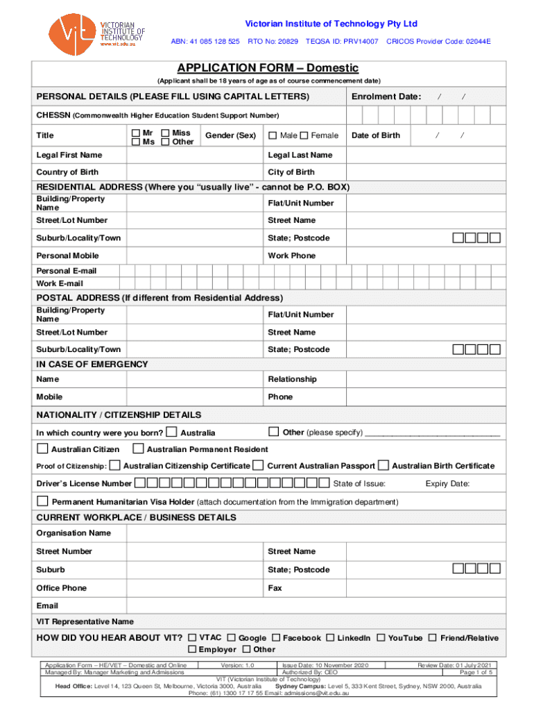 Victorian Institute of Technology Pty Ltd ABN: 41 085 128 525RTO No: 20829TEQSA ID: PRV14007CRICOS Provider Code: 02044EAPPLICATION FORM Domestic (Applicant shall be 18 years of age as of course commencement